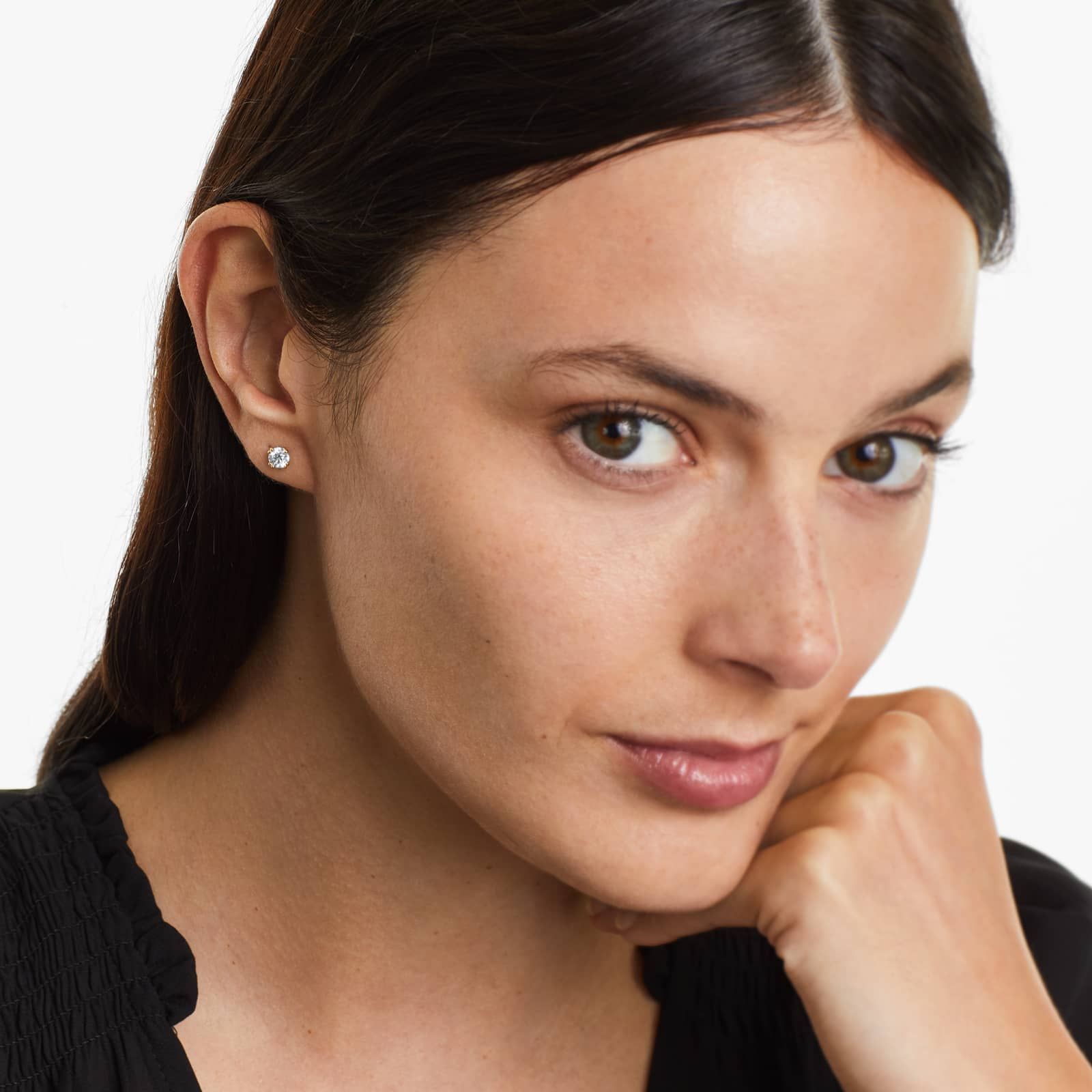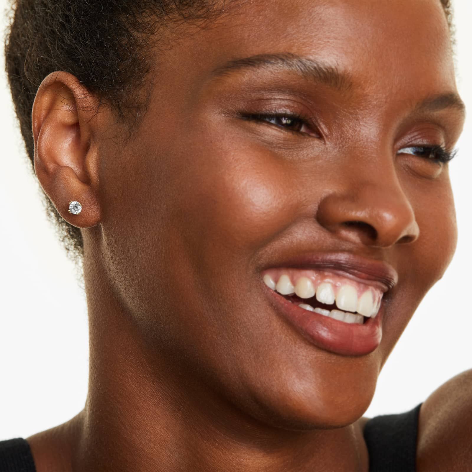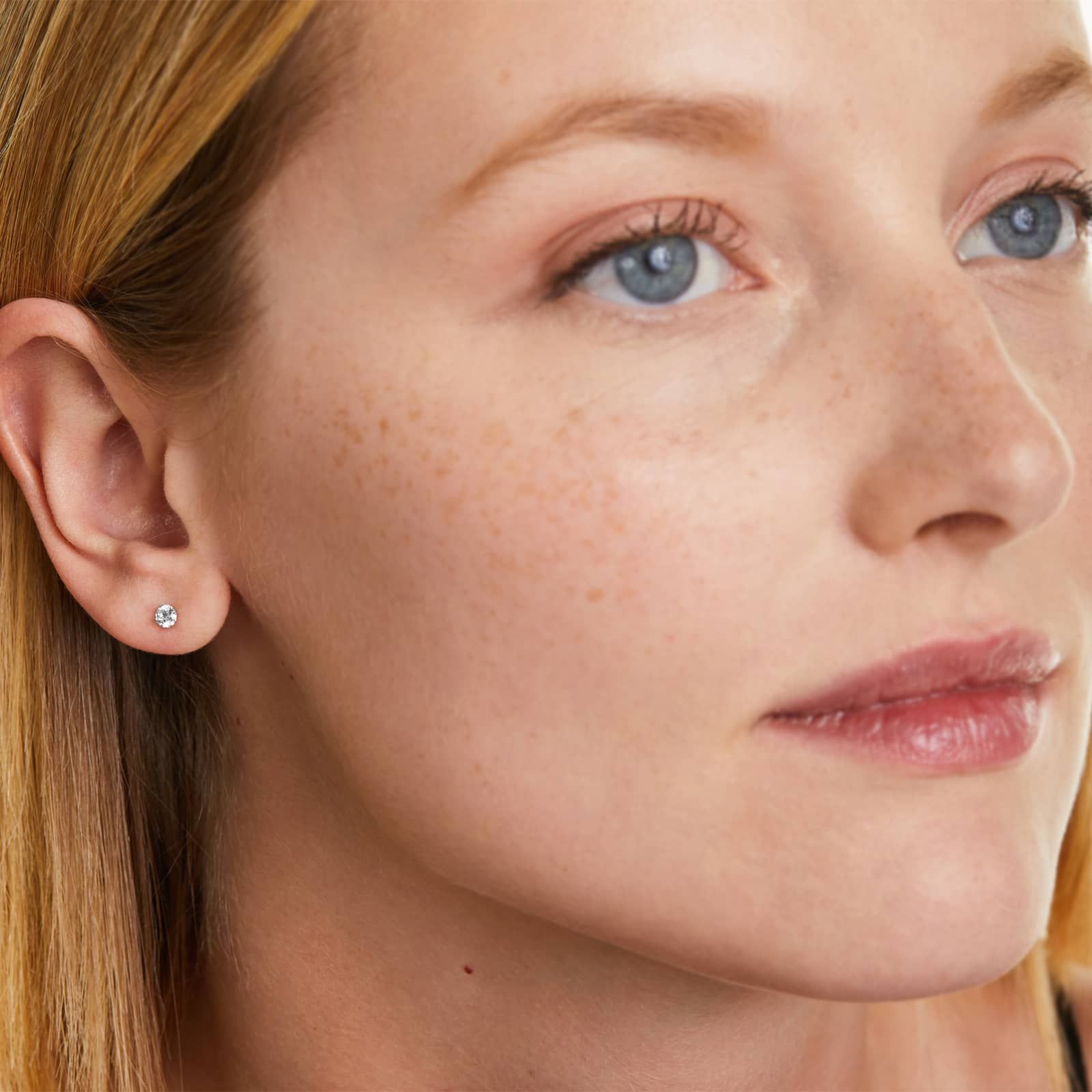 This design is sleek and sophisticated, made to accent the beauty of the round brilliant lab created diamond by using split prongs and a tapered wire basket. This earring will fit snugly against the ear and features friction backs.