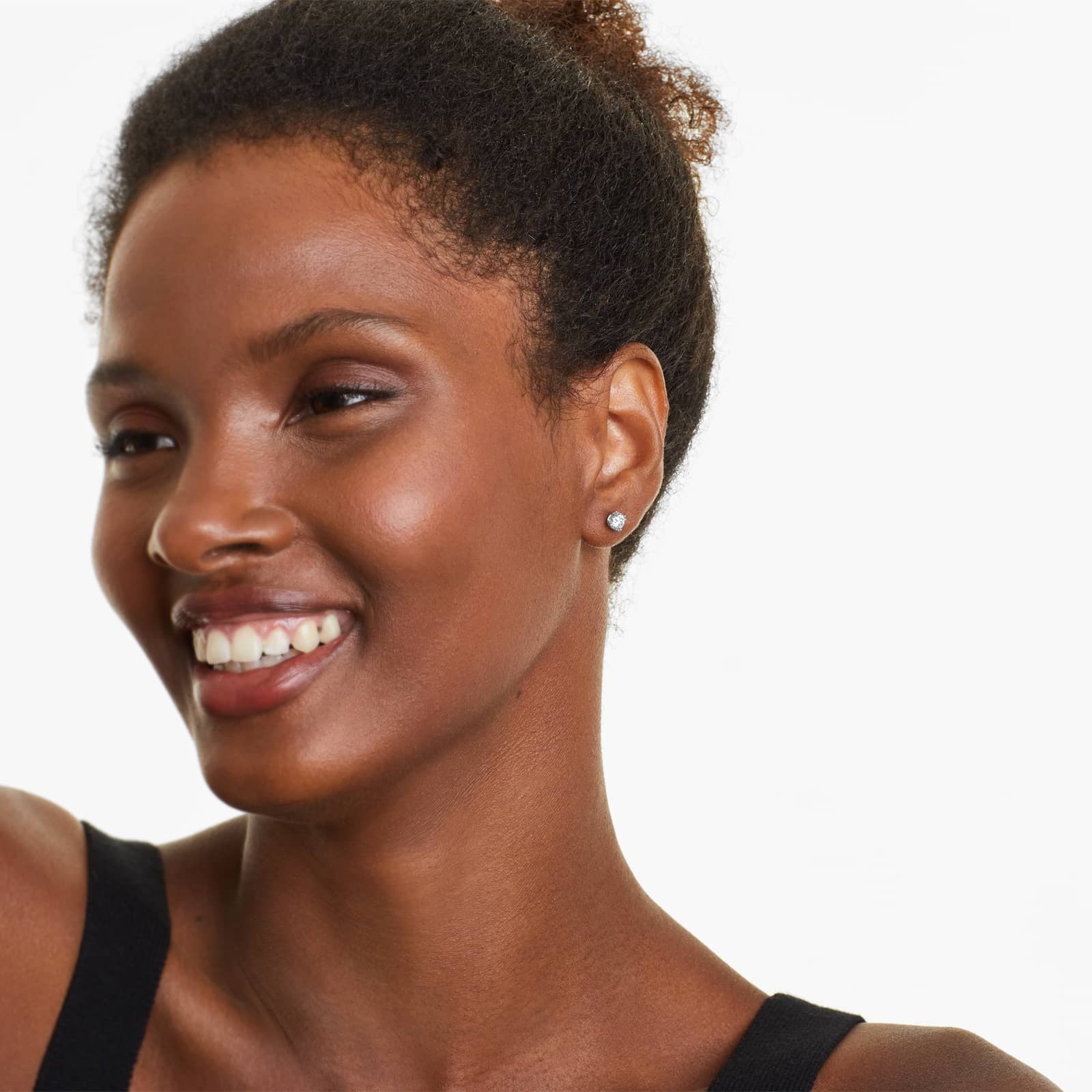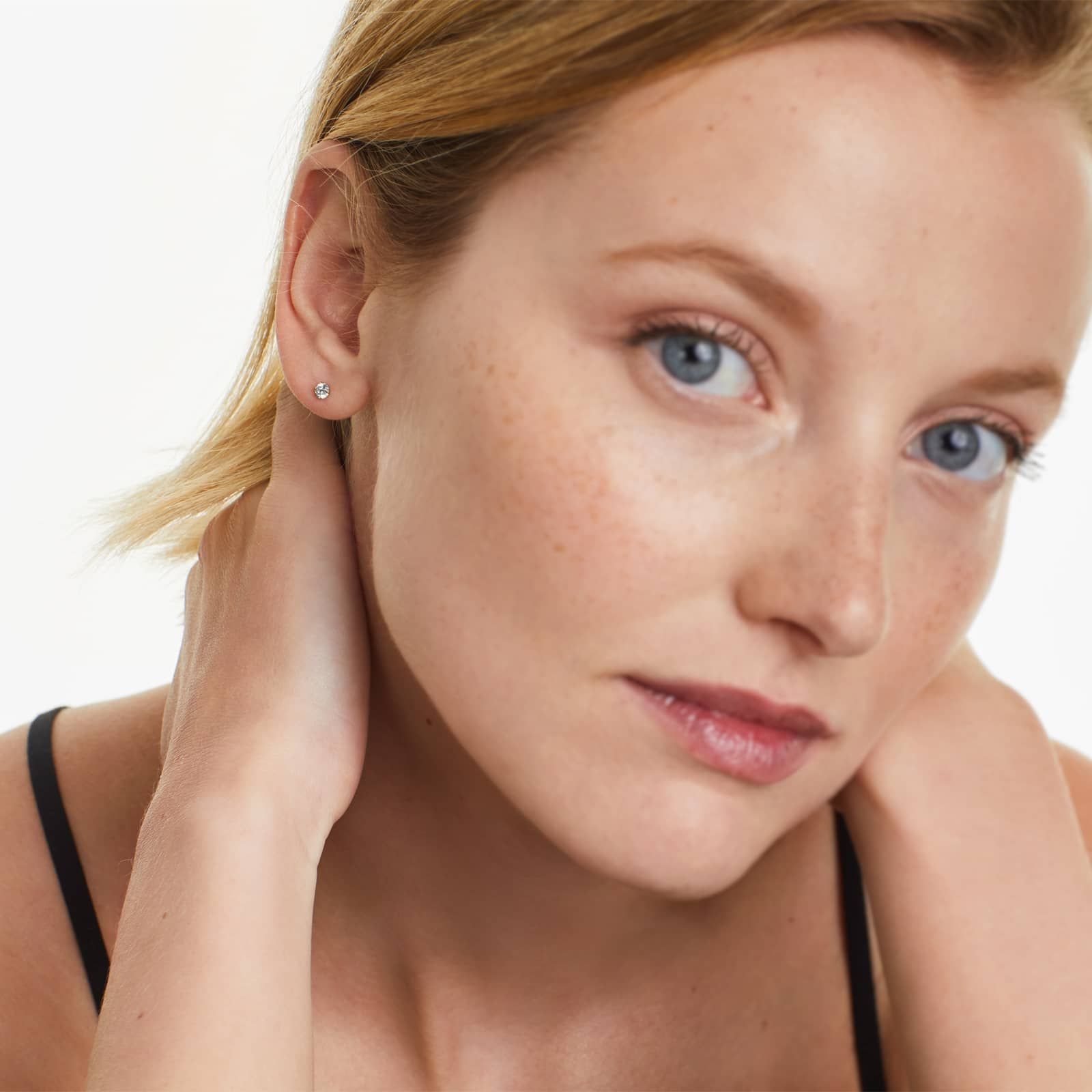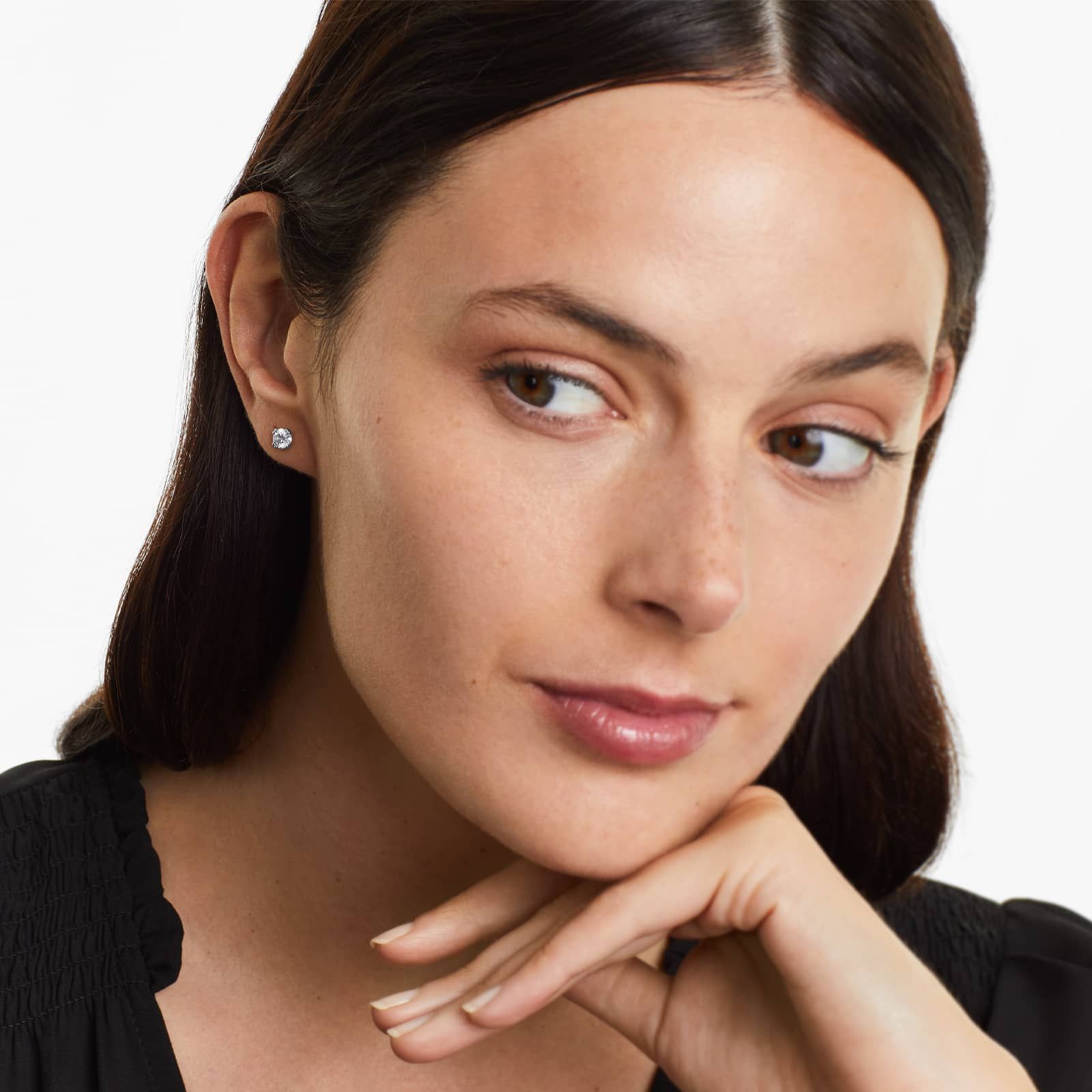 This design is sleek and sophisticated, made to accent the beauty of the round brilliant lab created diamond by using split prongs and a tapered wire basket. This earring will fit snugly against the ear and features friction backs.