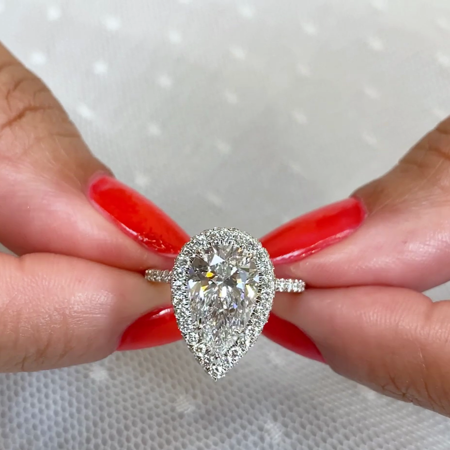 • Brilliant 2.50ct pear-shaped center with halo sparkle