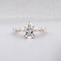 This handcrafted 3.34tcw lab-grown diamond engagement ring features a brilliant 2.50ct pear-cut center stone paired with 0.84ct of marquise and round diamonds along the band. The tapered side-stone layout highlights the shape of the pear center and adds soft, even sparkle from every angle.