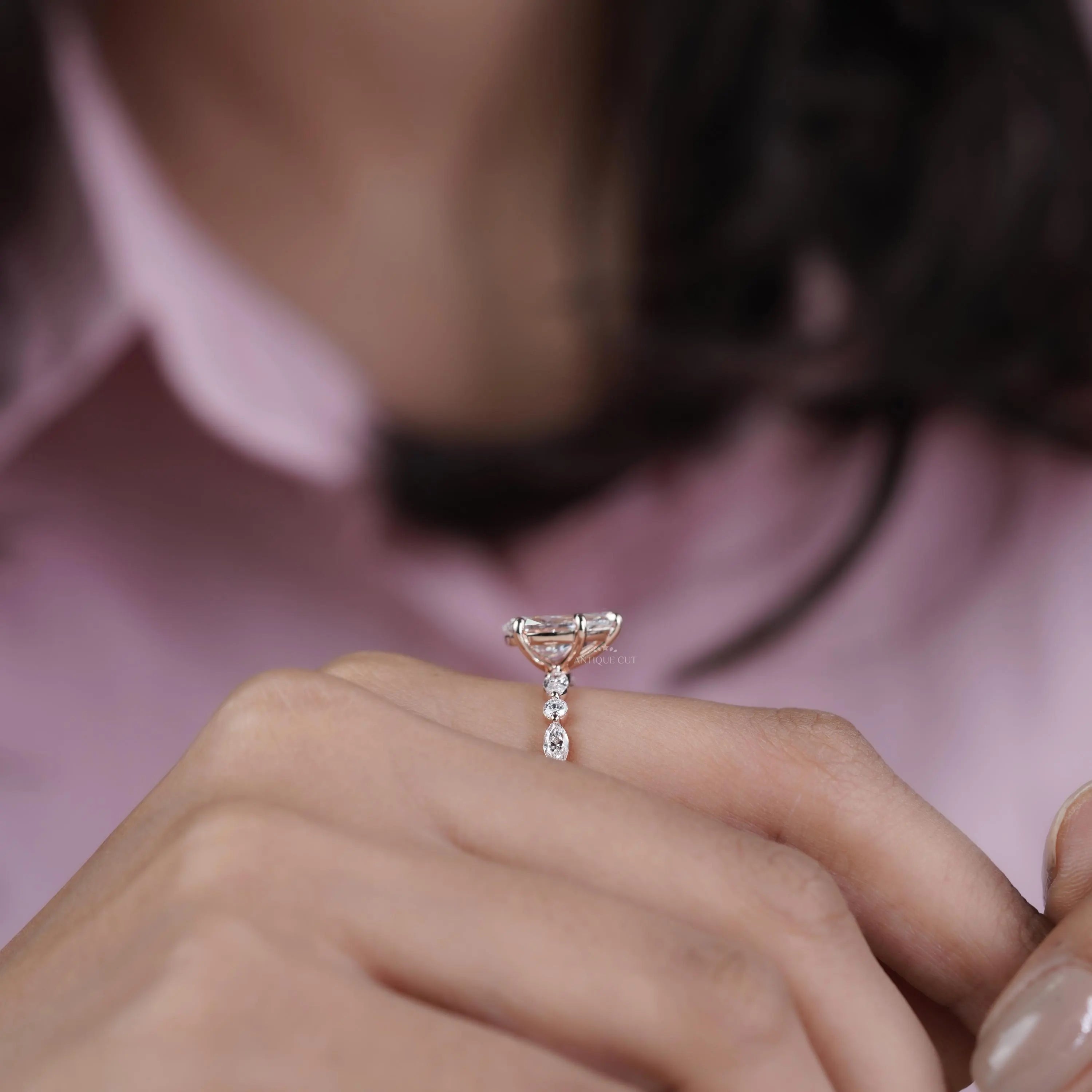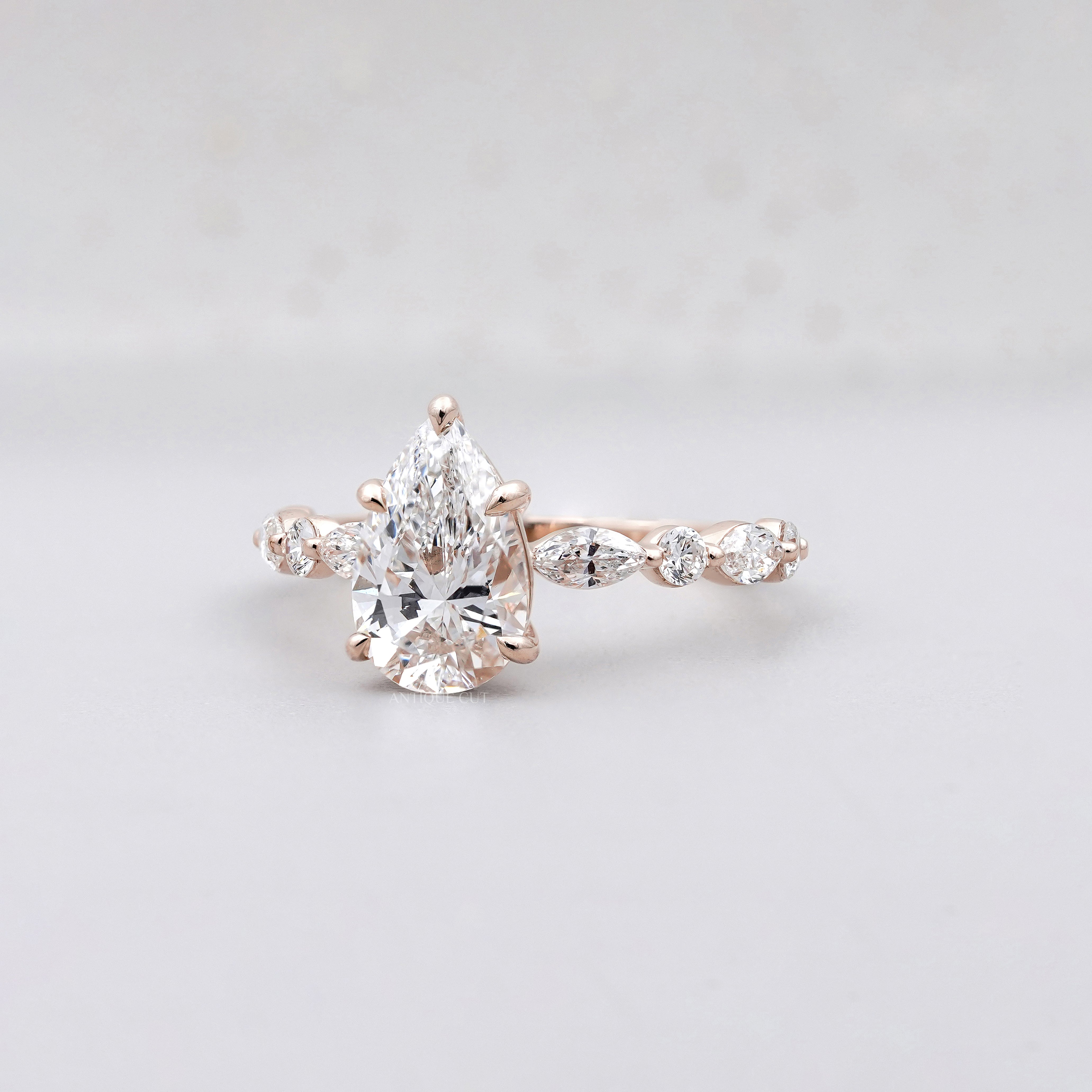 Pear 3.34tcw Lab Grown Diamond Vintage Engagement Ring | Marquise Side Stone Band | D–F Color | VVS–VS Clarity | IGI Certified