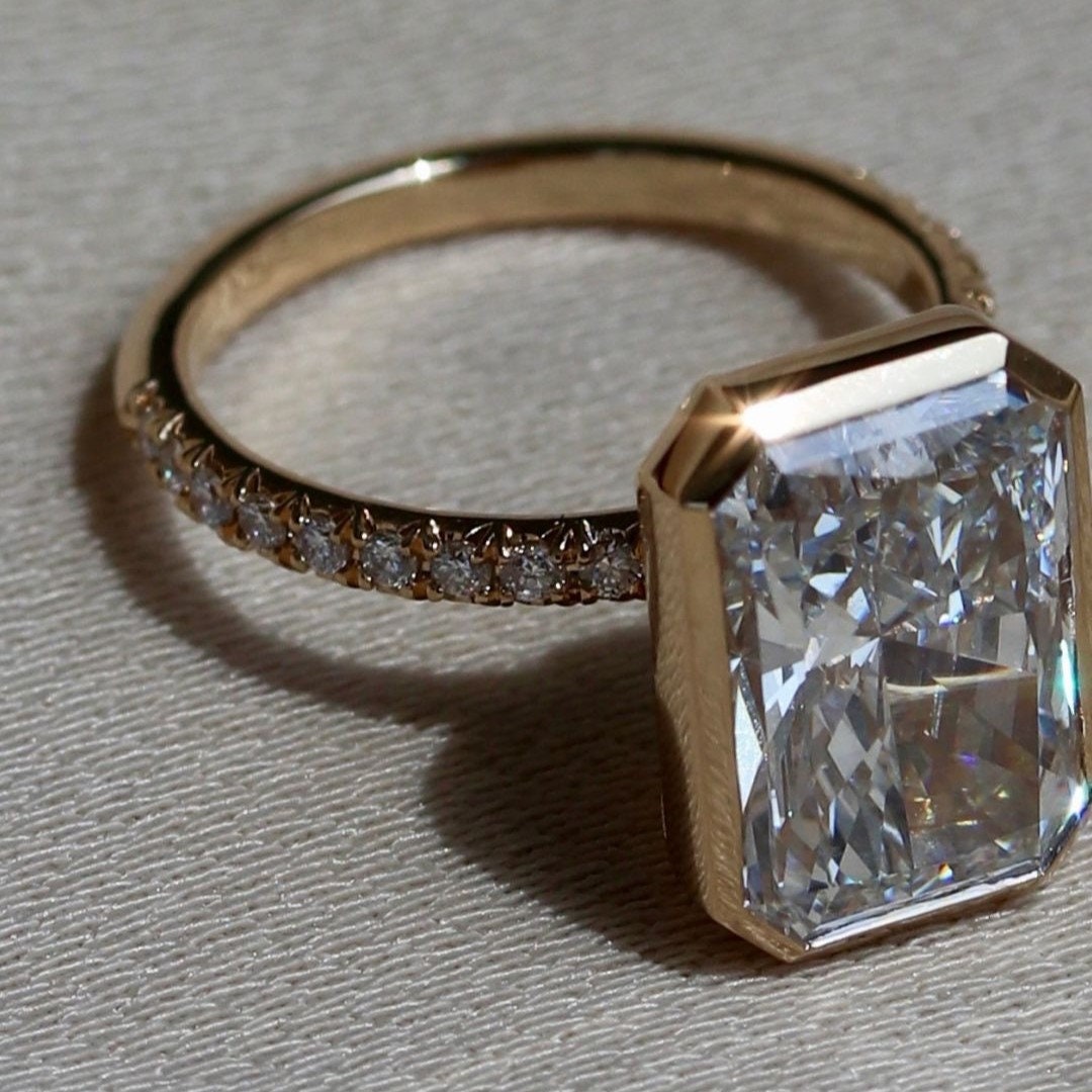 Stunning 5.30tcw Radiant lab diamond engagement ring with bezel setting and pavé accents. Features a 5.00ct center, IGI certified, DEF color, VVS–VS clarity.