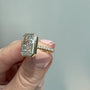✓ Bold 5.00ct radiant-cut centerpiece with pavé side stones