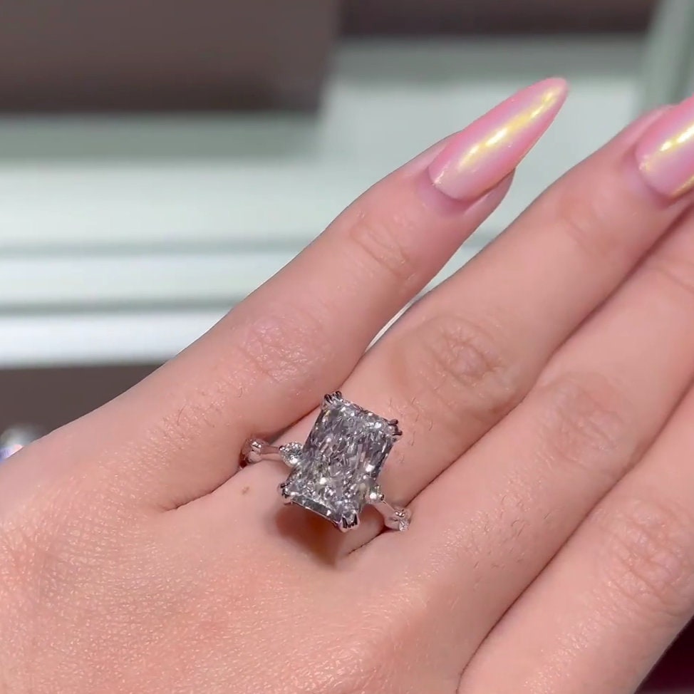 Make a bold statement with this 5.30tcw Radiant Lab Diamond Ring, featuring a 5.00ct center, hidden halo, and accent diamonds. IGI certified and handcrafted in 10k, 14k, or 18k gold. A luxurious choice for proposals and milestone moments.