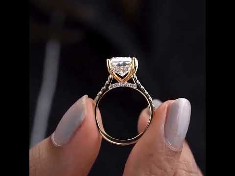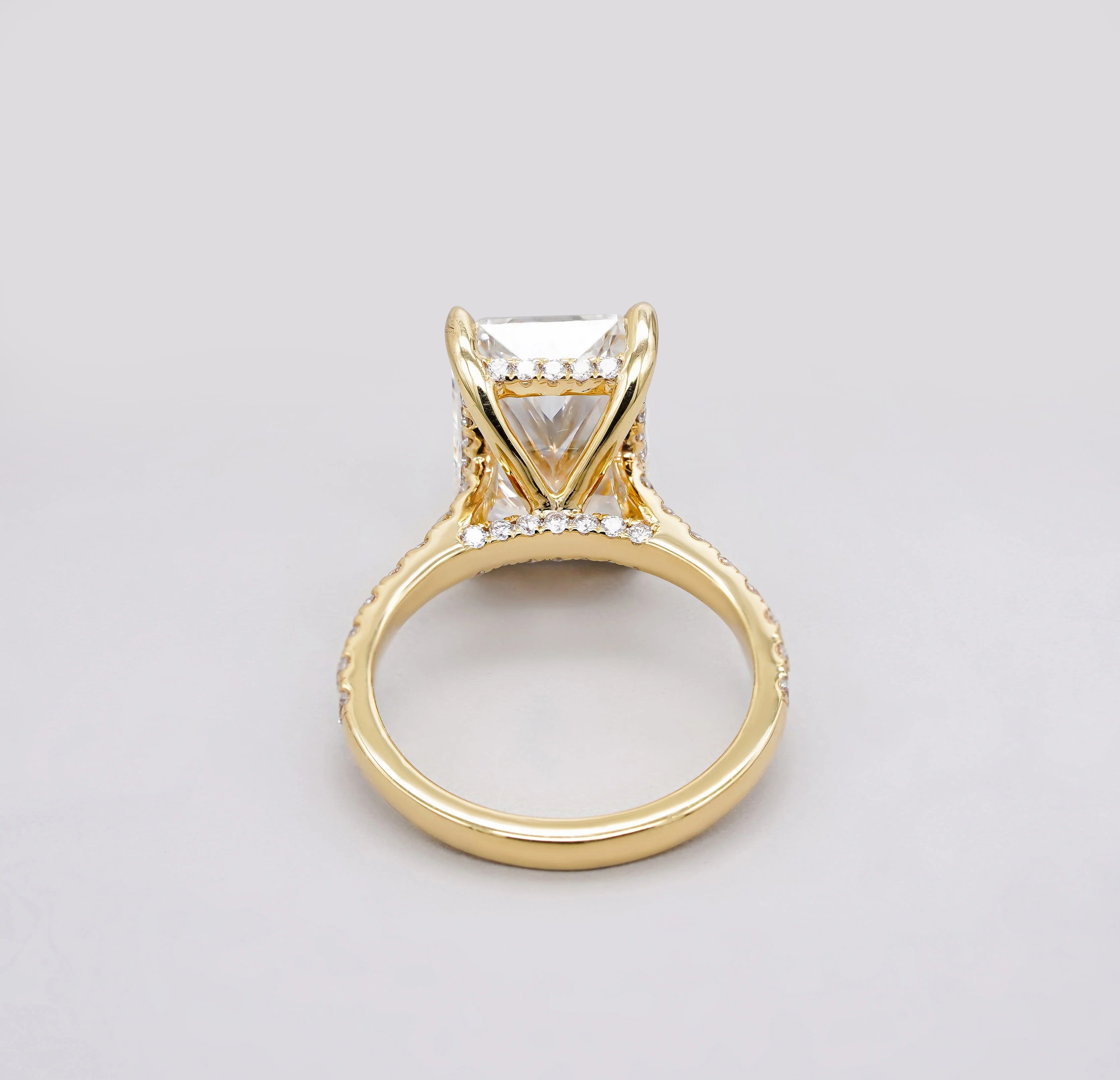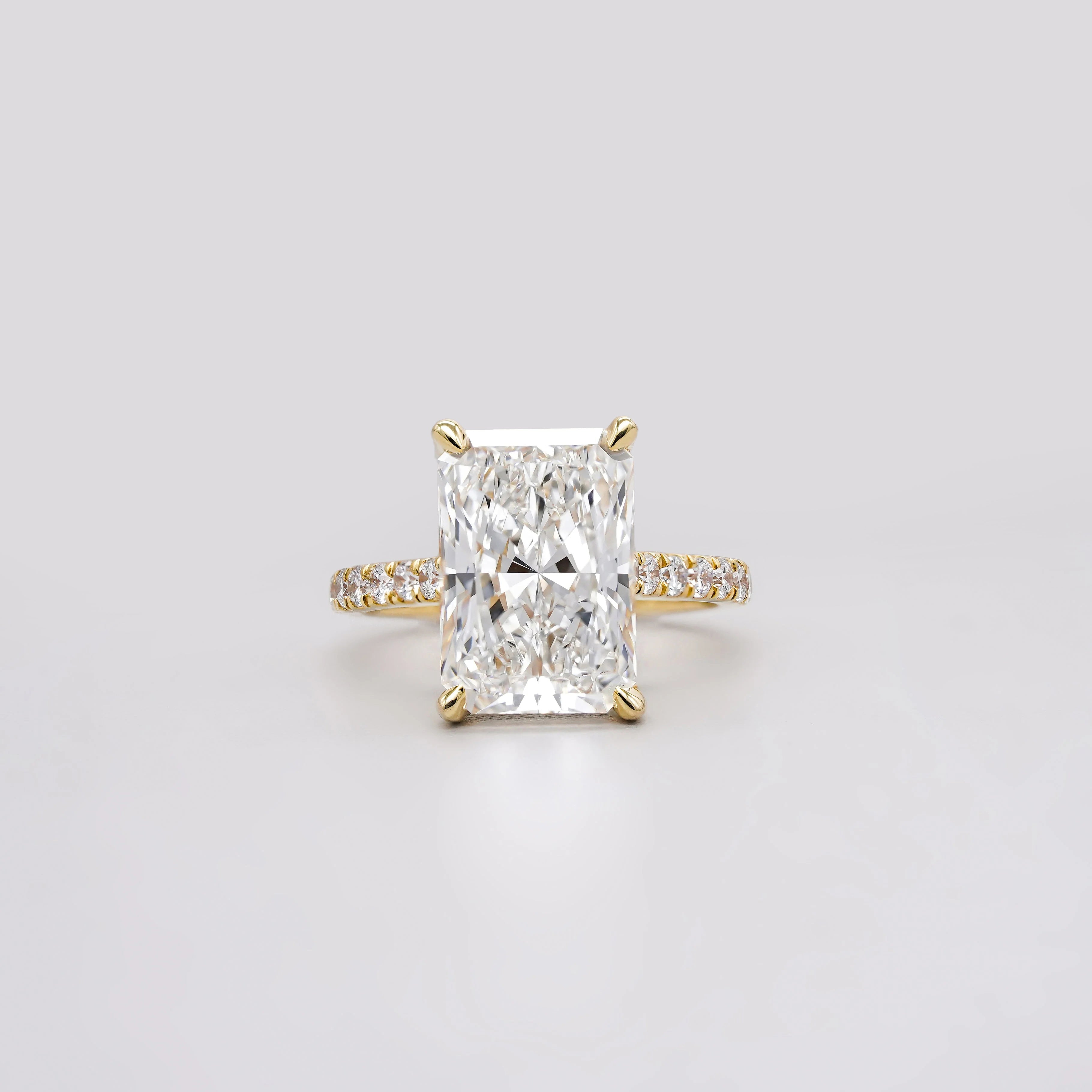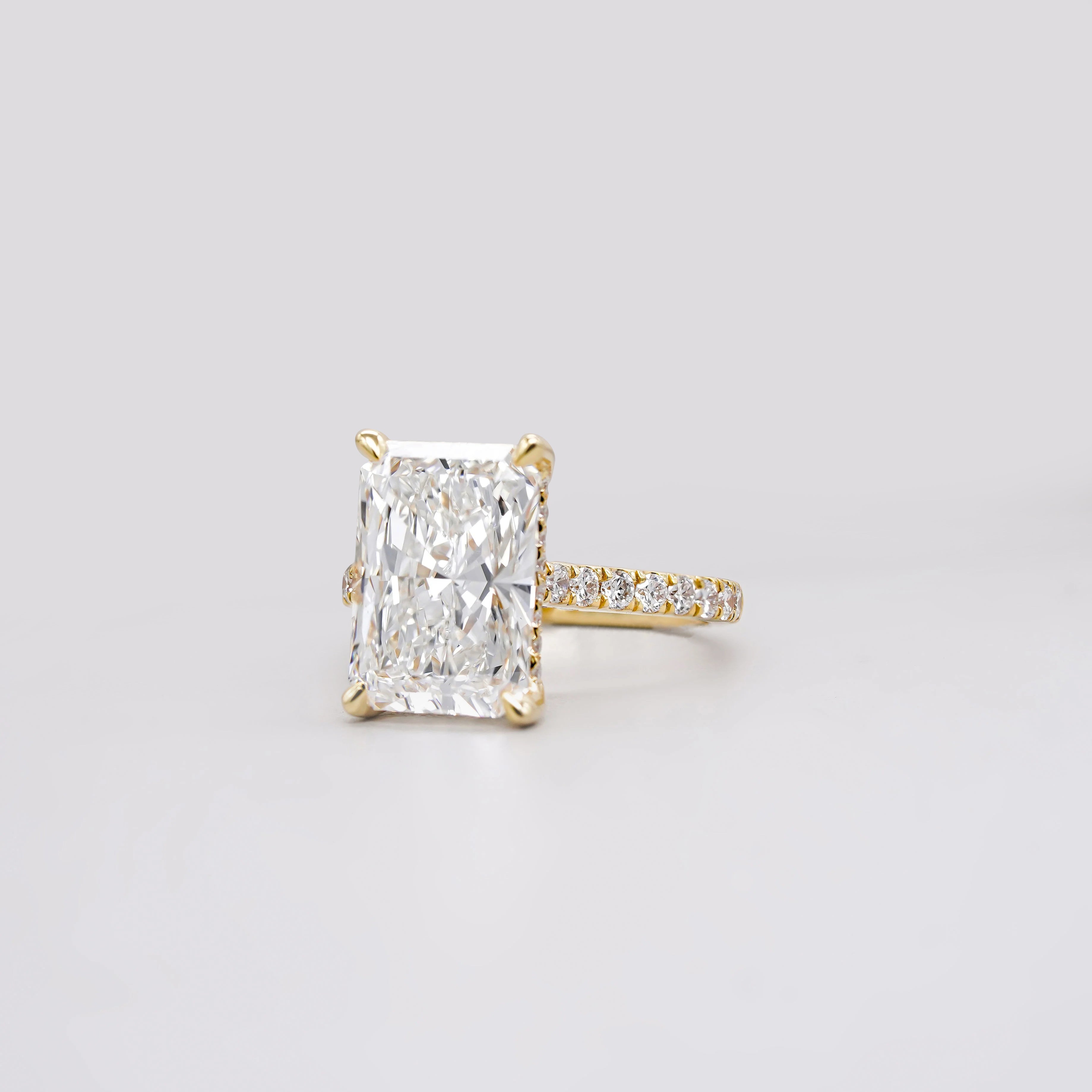 5.60tcw Radiant Lab Grown Diamond Engagement Ring | 5.00ct Radiant Center + 0.60ct Pavé & Hidden Halo | DEF VVS–VS | Cathedral 10K 14K 18K Yellow Gold | IGI Certified