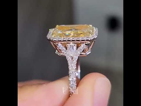 • Striking 7.00ct Fancy Yellow radiant-cut lab-grown center diamond