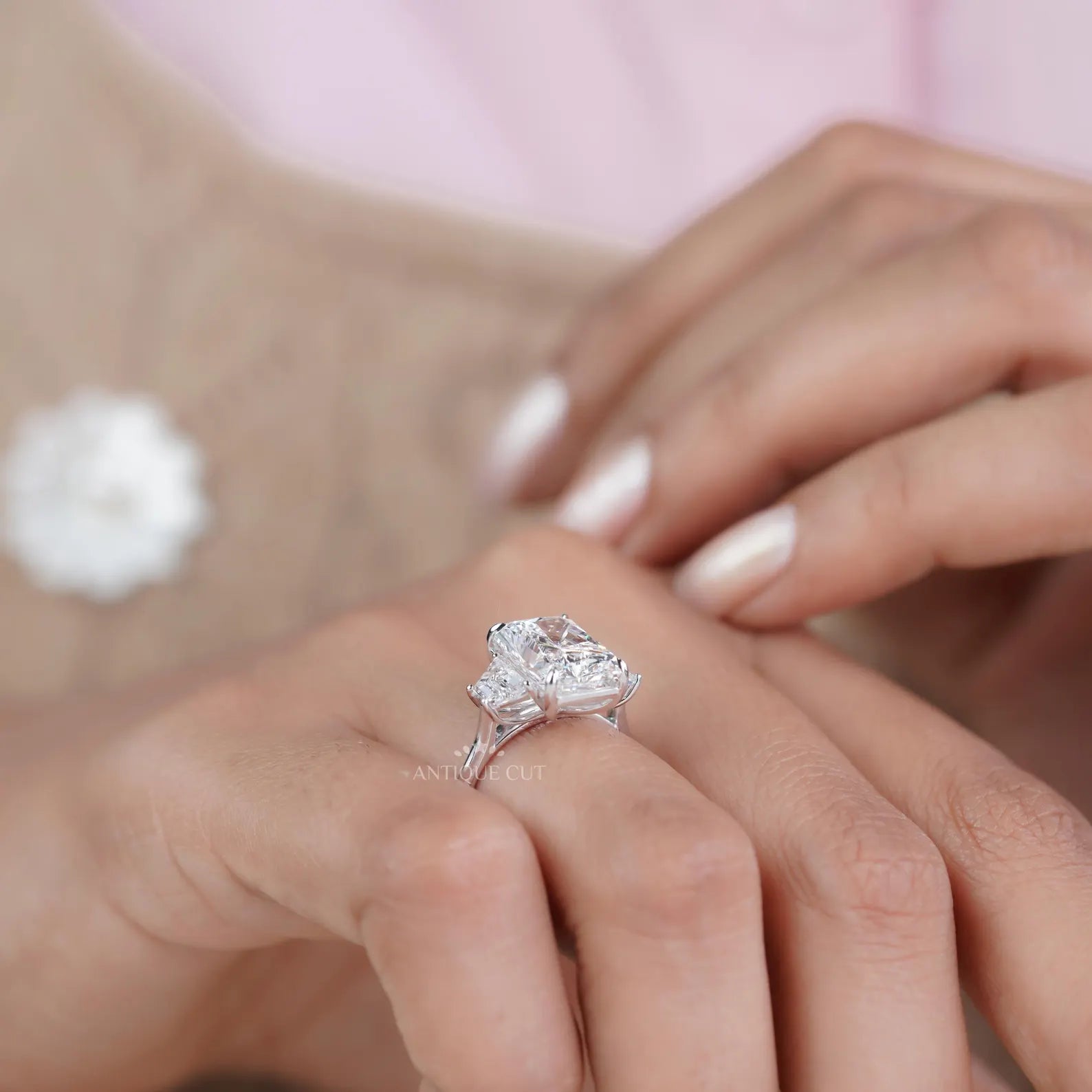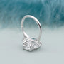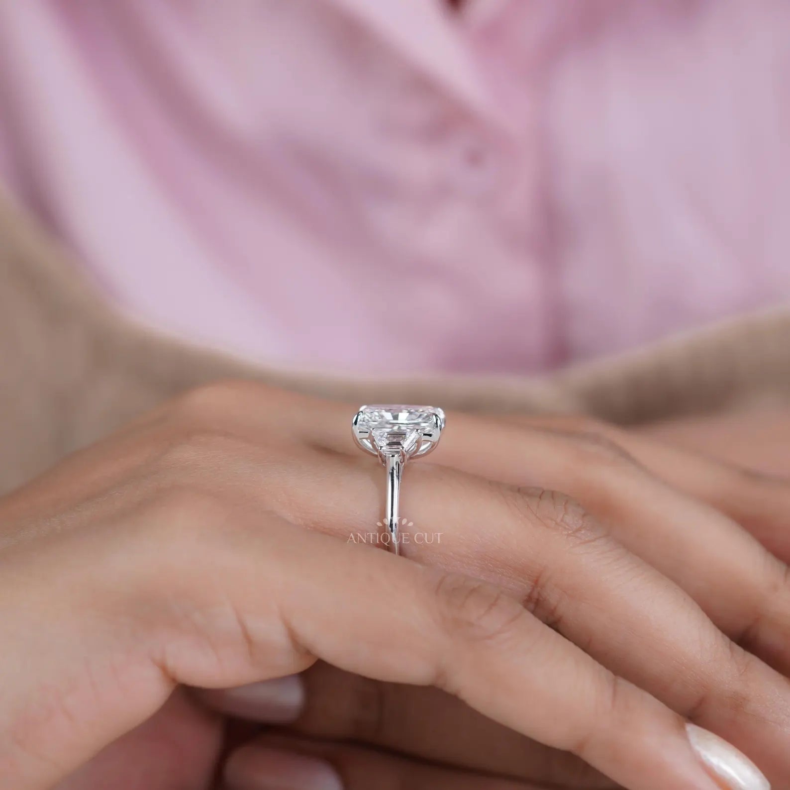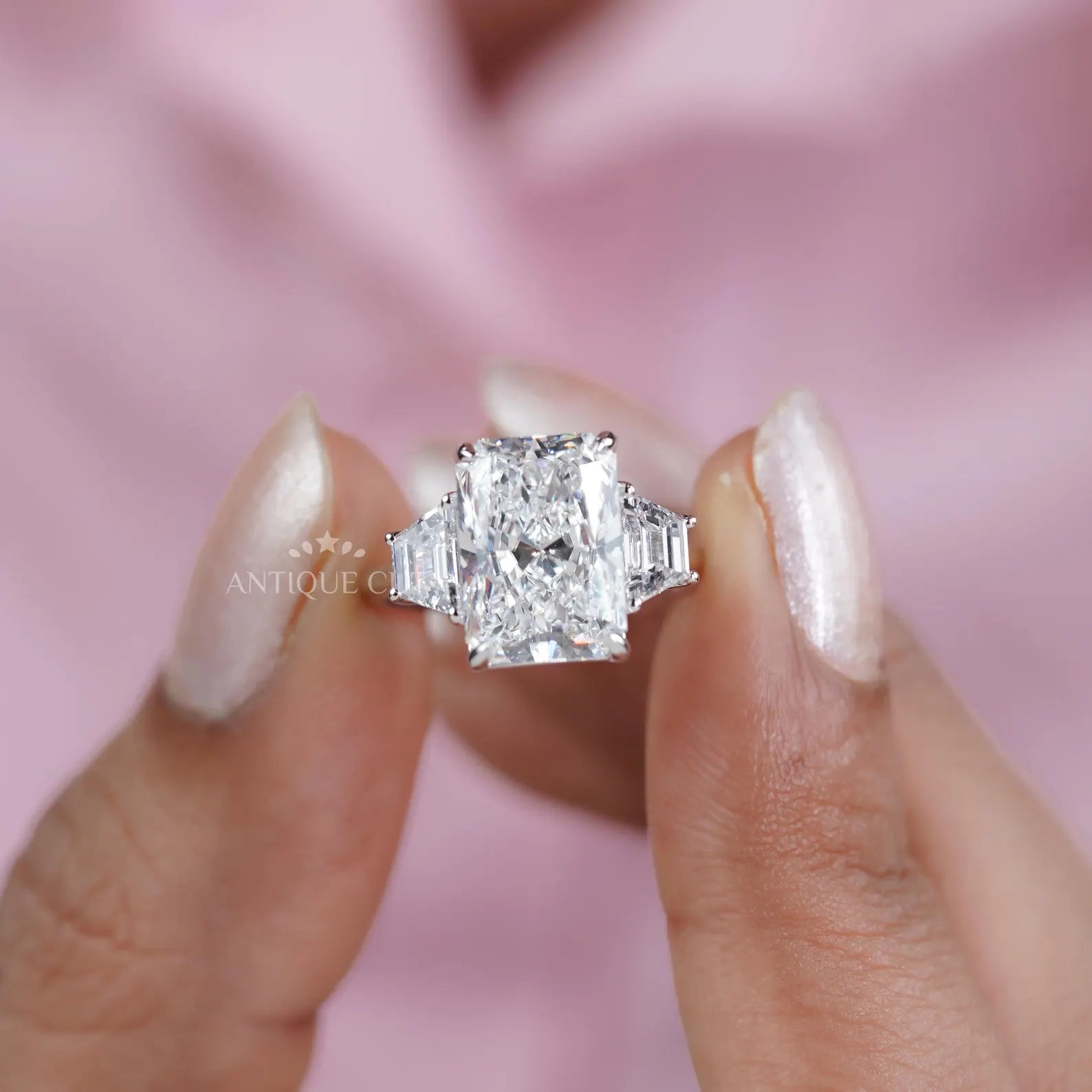 This handcrafted three-stone engagement ring showcases an impressive 5.09ct radiant-cut lab-grown diamond, paired with 0.88ct of matching trapezoid diamonds for a total of 5.97tcw. The radiant center delivers bold fire and a clean, elongated silhouette, while the trapezoid sides add balance and a refined architectural look.