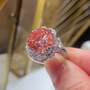 This Round 4.50tcw Fancy Pink Lab-Grown Diamond Engagement Ring is a bold expression of elegance. The stunning 2.50ct round center stone in a vibrant fancy pink hue is flawlessly surrounded by a double halo of brilliant white diamonds totaling 2.00ct, all set in a luxurious 14k/18k white gold band.