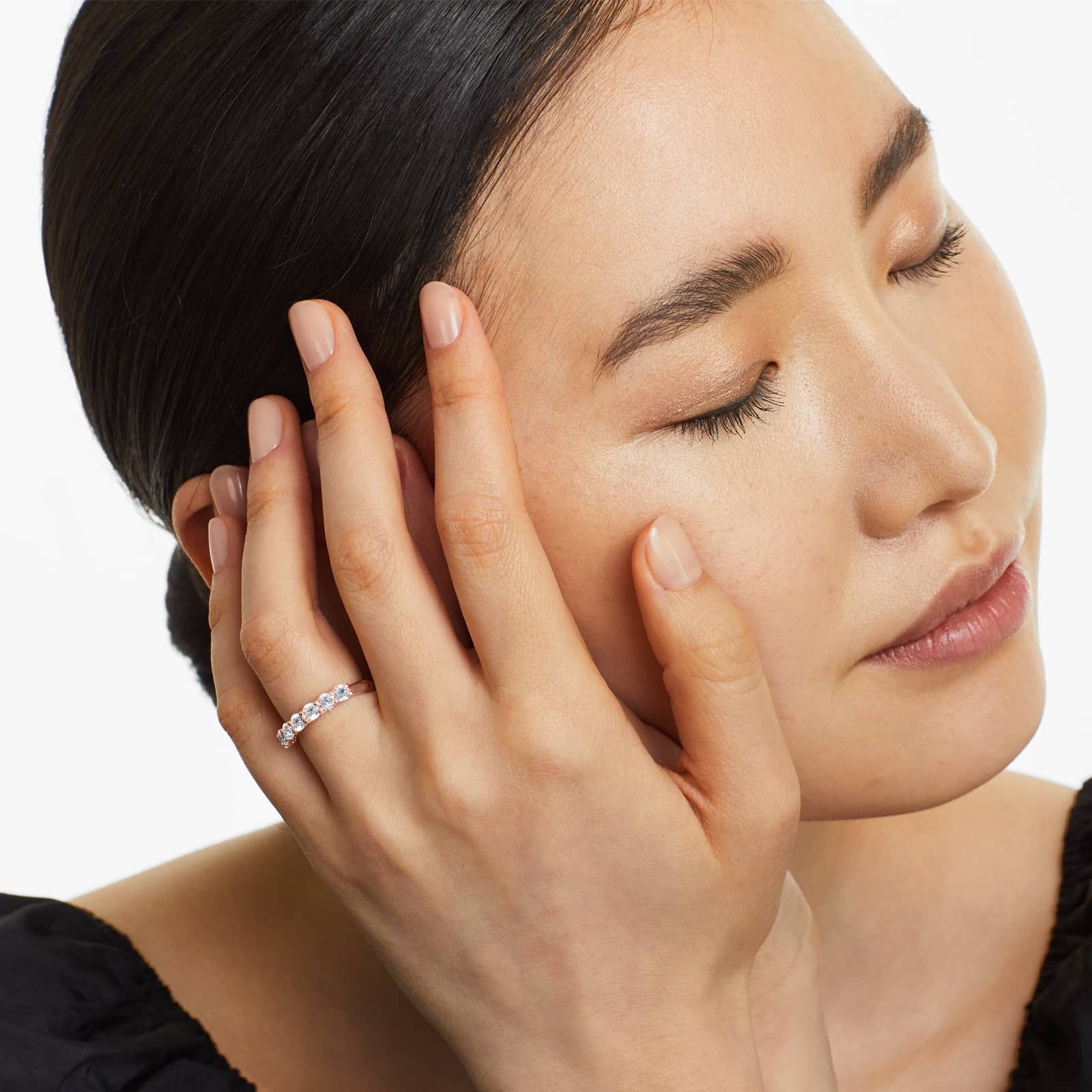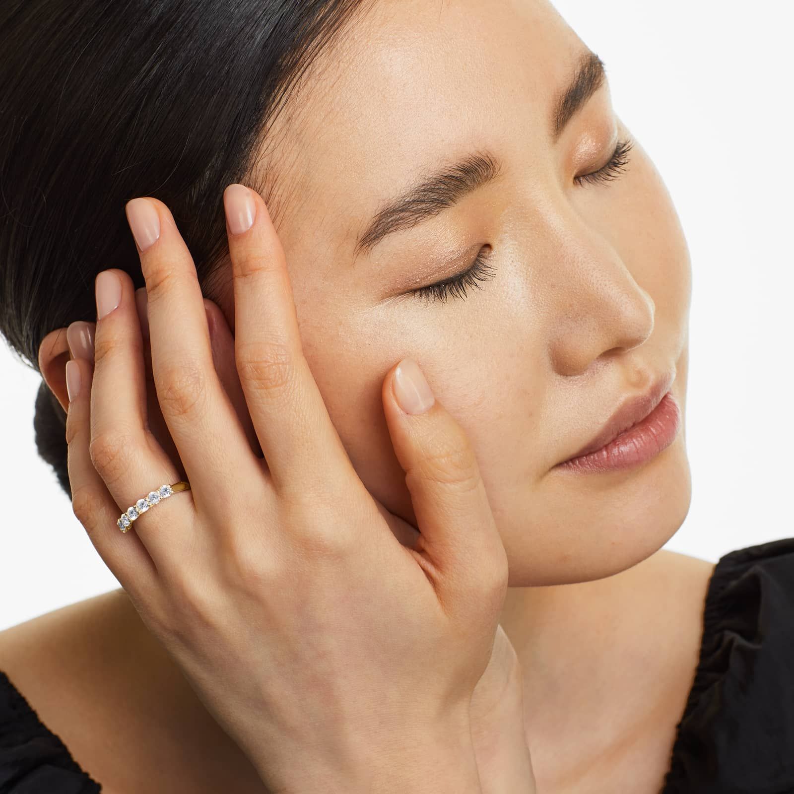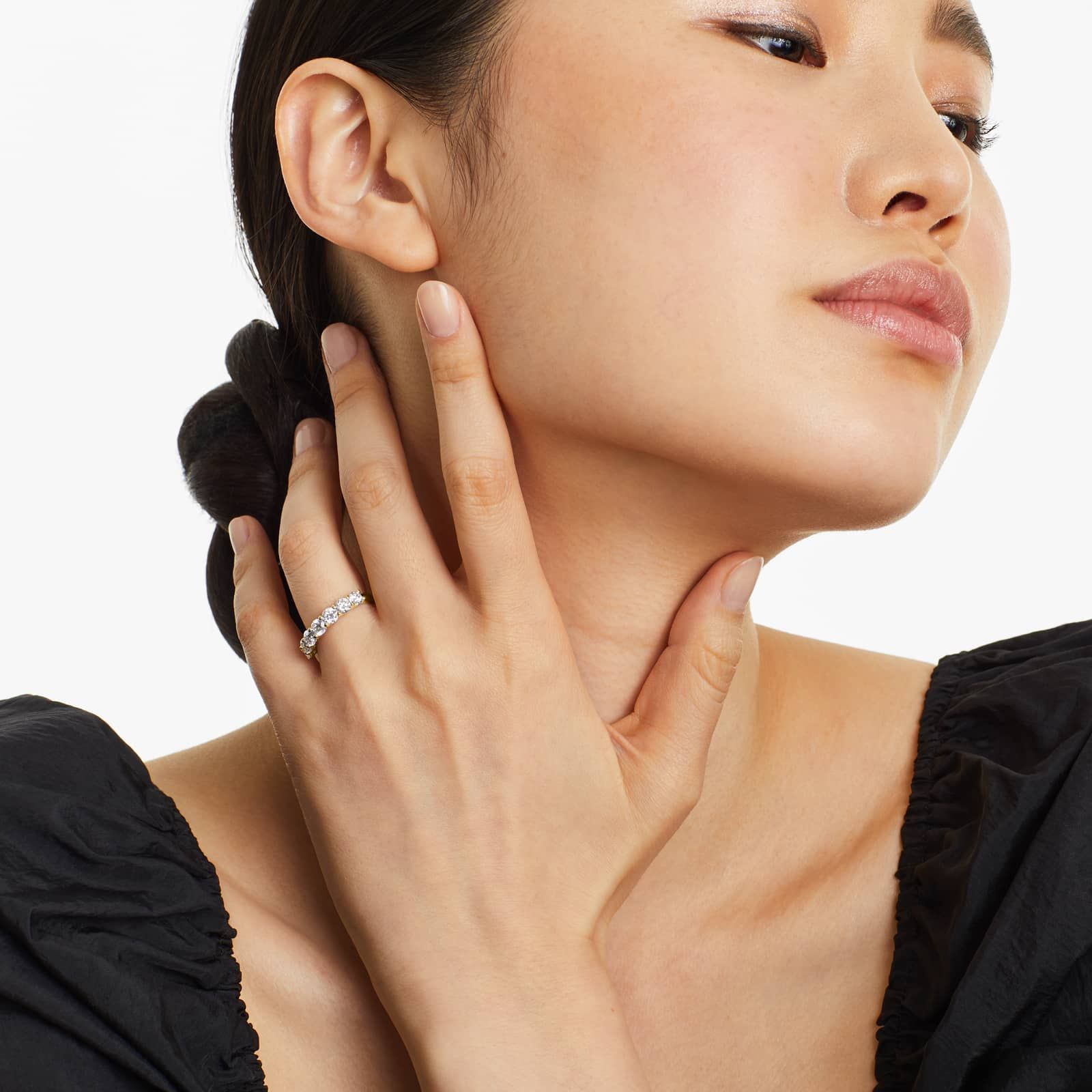 Seven lab grown brilliant cut diamonds are exquisitely displayed in a common prong setting that features low profile, lab grown diamonds rounded baskets for maximum comfort and elegance.