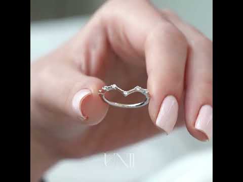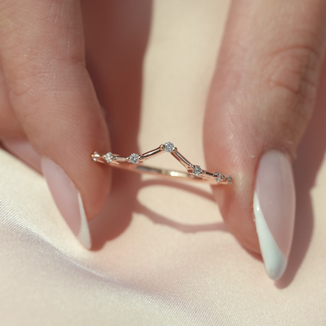 The Chevron Penelope is a sleek wedding band featuring a distinctive chevron pattern. It showcases a row of small, round brilliant diamonds set along half of the 1.5 mm band, offering subtle sparkle and designed for comfortable everyday wear by Unii Jewels. This elegant band complements engagement rings and stacked band collections, perfect for those who appreciate traditional luxury with a modern flair.